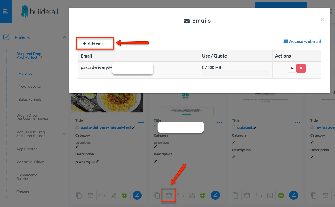 Go to your MY SITES page, and click on the Email icon next to your desired website with a connected domain. This option will only appear after you have connected your own domain. Your password’s strength has to meet our security requirements (it should ideally contain between 6 - 12 characters, and include numbers and letters), otherwise our system will not let you create an email address.